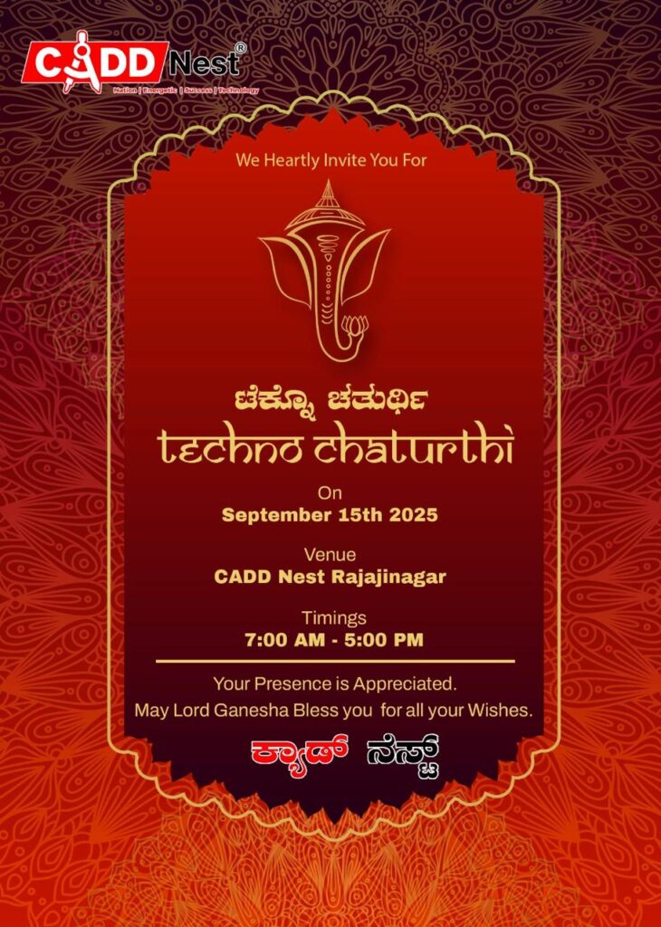 ಬೆಂಗಳೂರಿನ ರಾಜಾಜಿನಗರದ ಕ್ಯಾಡ್ನೆಸ್ಟ್ ಶಿಕ್ಷಣ ಸಂಸ್ಥೆಯಲ್ಲಿ ಸೆಪ್ಟೆಂಬರ್ 15ರ ಸೋಮವಾರದಂದು ಬಹುನಿರೀಕ್ಷಿತ “ಕ್ಯಾಡ್ನೆಸ್ಟ್ ಟೆಕ್ನೋ ಚತುರ್ಥಿ” ಕಾರ್ಯಕ್ರಮ ನಡೆಯಲಿದೆ. ಗಣೇಶ ಹಬ್ಬ, ಎಂಜಿನಿಯರಿಂಗ್ ದಿನವೆರಡರ ಸಂಯೋಜನೆಯ ಈ ಟೆಕ್ನೋ ಚತುರ್ಥಿಯಲ್ಲಿ ವಿದ್ಯಾರ್ಥಿಗಳ ಭವಿಷ್ಯದ ಕರಿಯರ್ಗೆ ಟಾನಿಕ್ ನೀಡುವಂತಹ ಆಸಕ್ತಿದಾಯಕ ಸ್ಪರ್ಧೆಗಳು ಇವೆ.
